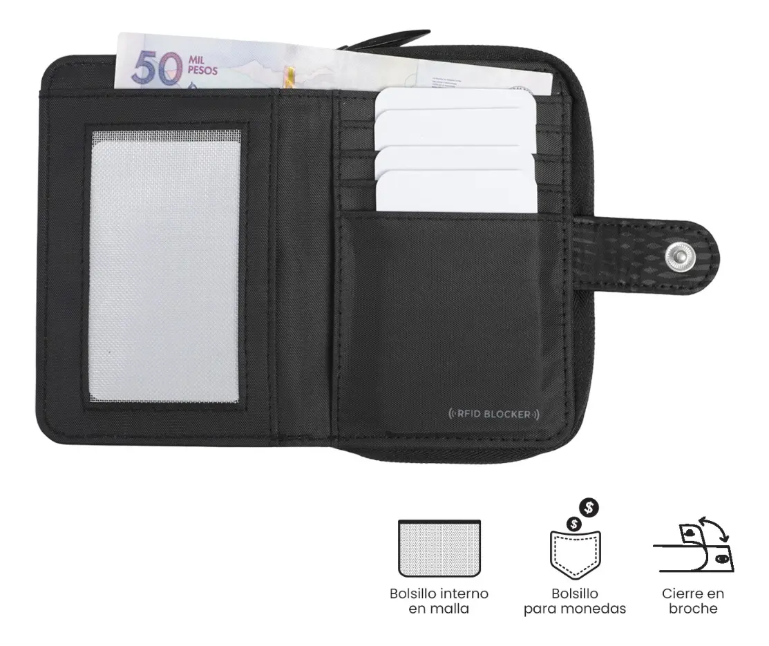 • Organizador para billetes: Un compartimento amplio que permite guardar el efectivo sin necesidad de doblar los billetes en exceso, manteniéndolos en buen estado.