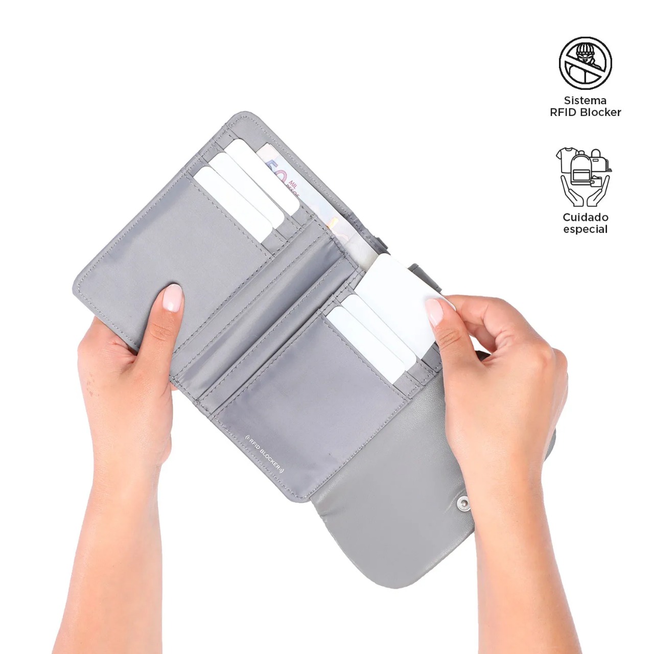 Protección RFID Blocker: Incorpora una capa especializada que evita escaneos no autorizados de tus tarjetas, previniendo clonaciones y garantizando la seguridad de tus datos personales.