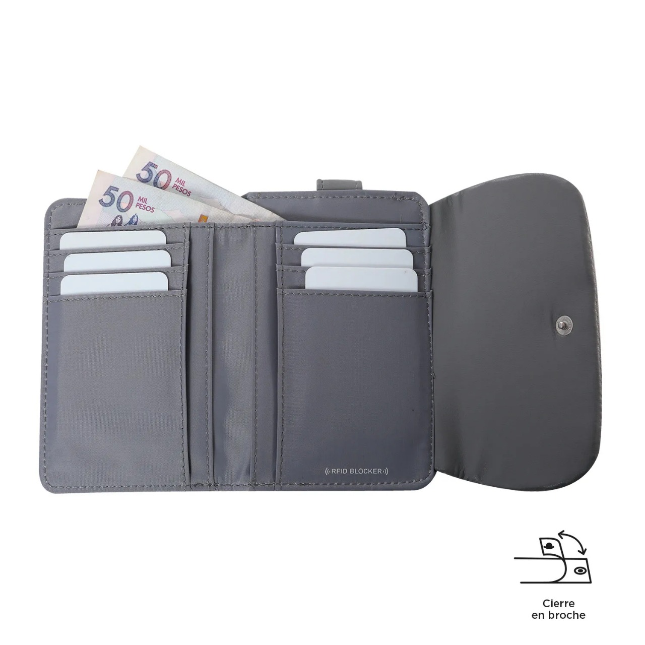 Cierre con broche imantado: Garantiza que tus pertenencias estén seguras sin sacrificar la comodidad al abrir o cerrar tu billetera.