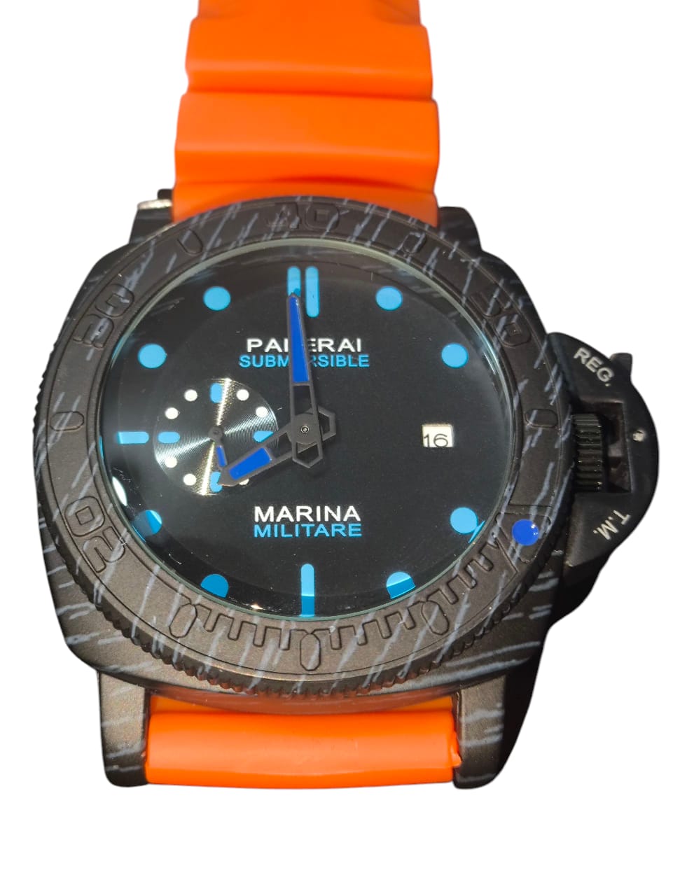 Reloj de pulso análogo para hombre con correa de silicona de color naranja que combina con una caja decorada con camuflado marino.